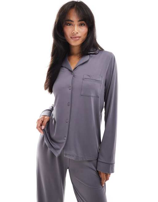 Loungeable super soft jersey revere top and wide leg pants pyjama set with piping detail in charcoal