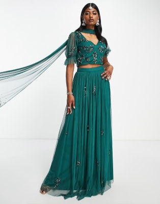 Maya v set embellished lehenga crop top, scarf and maxi skirt in emerald green