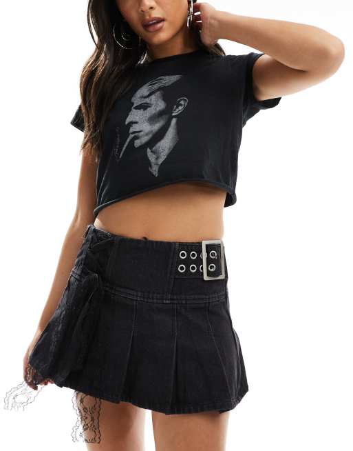 Minga London pleated micro mini skirt with lace up and buckle in black