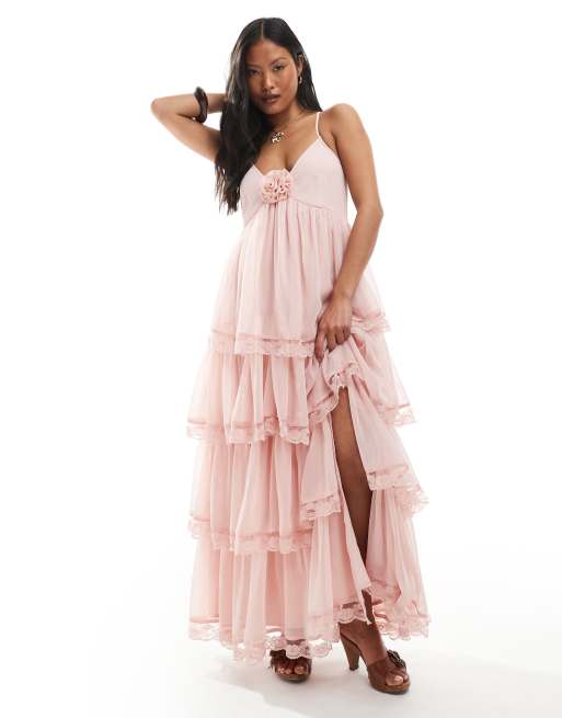 Miss Selfridge Petite race day chiffon tiered maxi dress in in dusky pink
