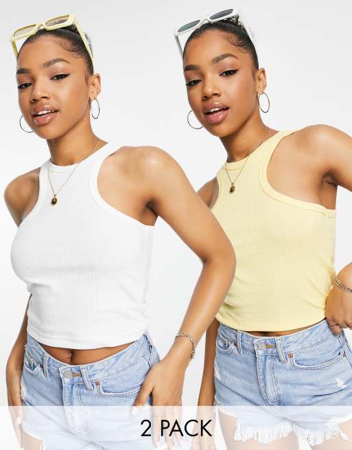 Miss Selfridge 2 pack sleeveless cut out racer neck singlet top in white and yellow