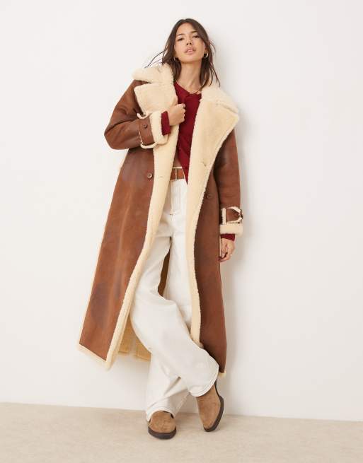 Miss Selfridge borg contrast belted maxi wrap coat in tan