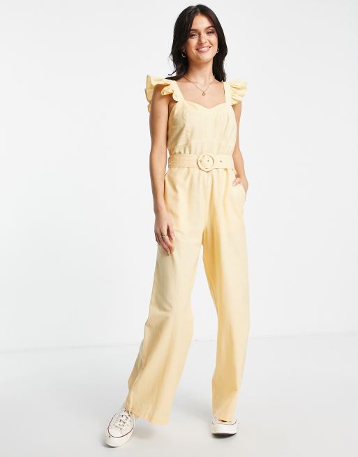 Miss Selfridge cotton flax frill strap belted jumpsuit in buttermilk