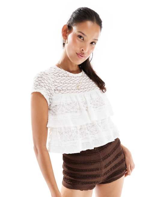 Miss Selfridge lace ruffle short sleeve top in cream