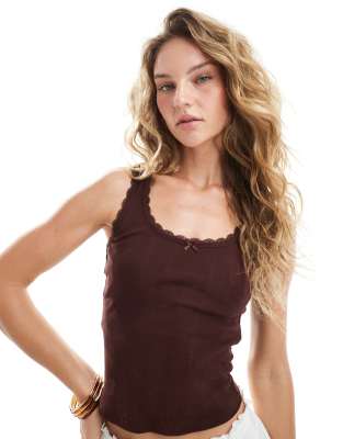 Miss Selfridge lace trim pointelle singlet in chocolate