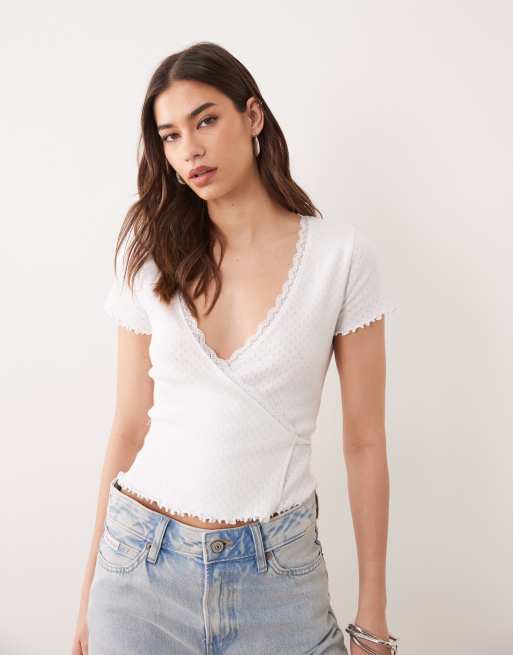 Miss Selfridge pointelle lettuce detail wrap top in white