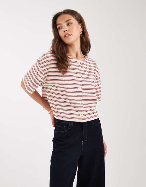 Miss Selfridge ribbed button up short sleeve cardigan in stripe