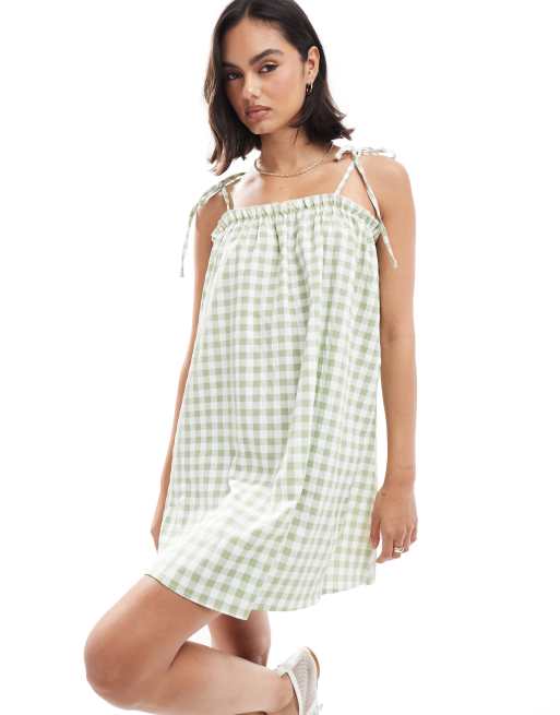 Miss Selfridge sage gingham tie shoulder smock dress