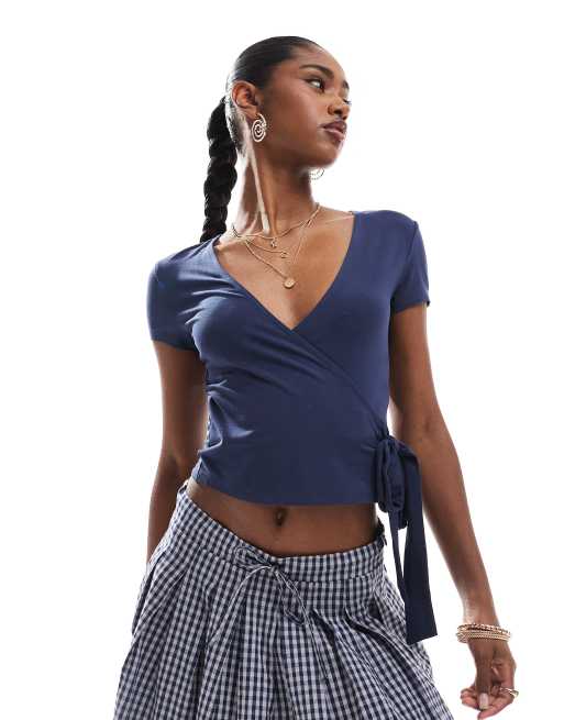 Miss Selfridge short sleeve jersey wrap top in navy