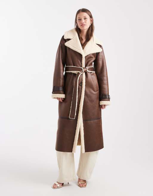 Miss Selfridge suedette borg belted wrap coat in chocolate