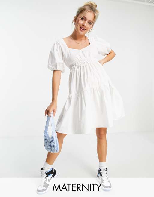 Missguided Maternity shirred mini dress with puffed sleeve in white