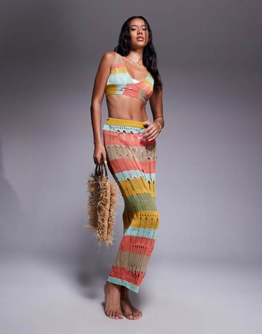 Missy Empire beach distressed knit bralet and maxi skirt set in multi stripe