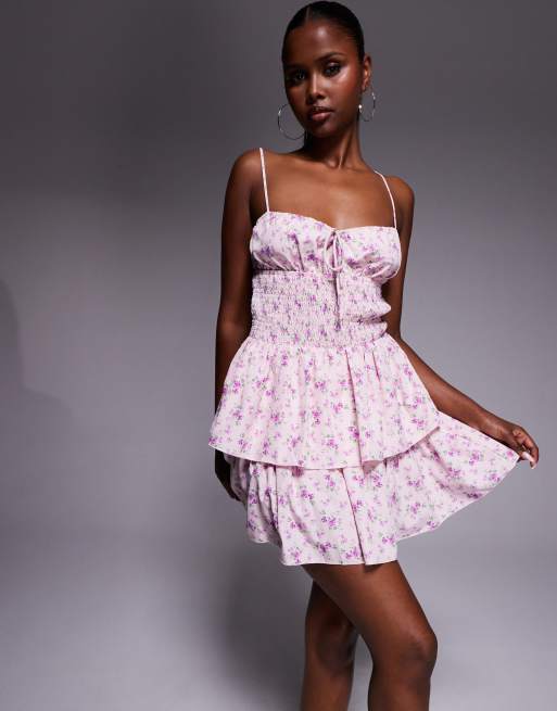 Missy Empire shirred waist tie front tiered cami mini dress in pink floral