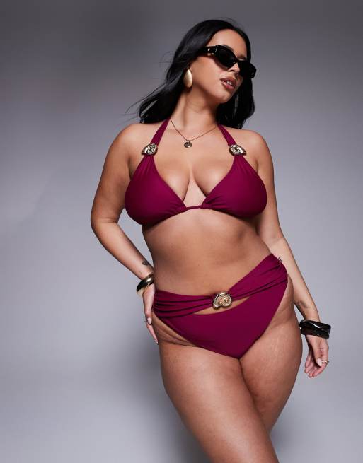 Moda Minx Curve bikini bottoms with gold hardware detail in berry