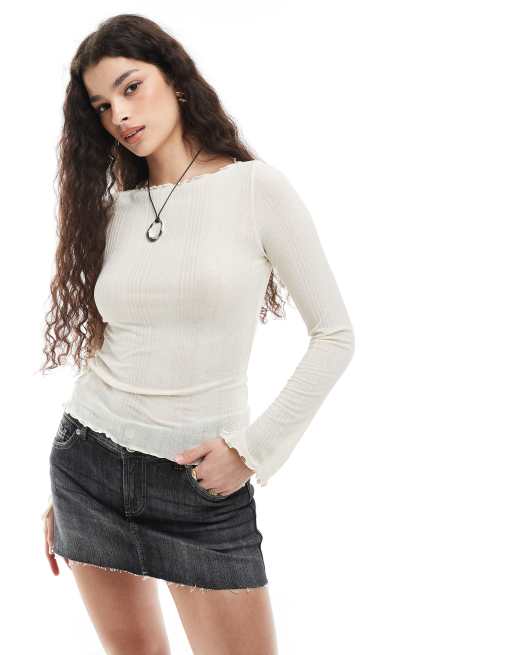 Monki long sleeve boat neck ribbed structure jersey top with lettuce hemlines and cuff slits in off white