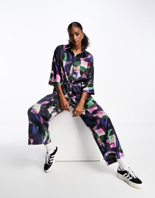 Monki long sleeve jumpsuit with collar in abstract print