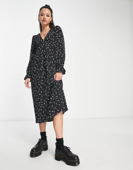Monki long sleeve midi dress in black ditsy print