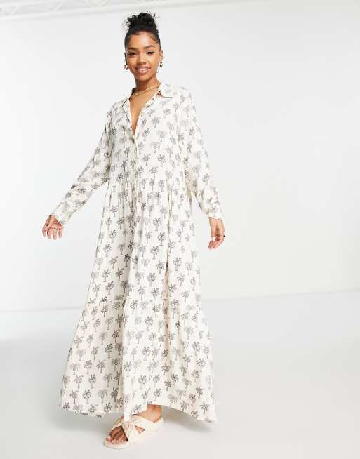 Monki long sleeve midi smock shirt dress in white palm tree print