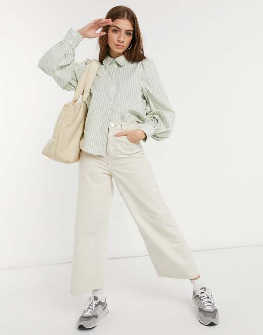 Monki Phrida cotton puff sleeve shirt in green stripe - MGREEN