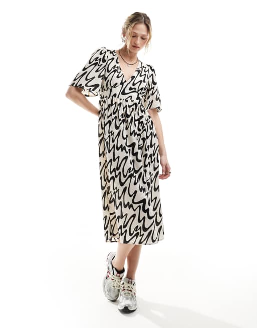 Monki short sleeve midi sun dress with side split in mono abstract print exclusive to ASOS