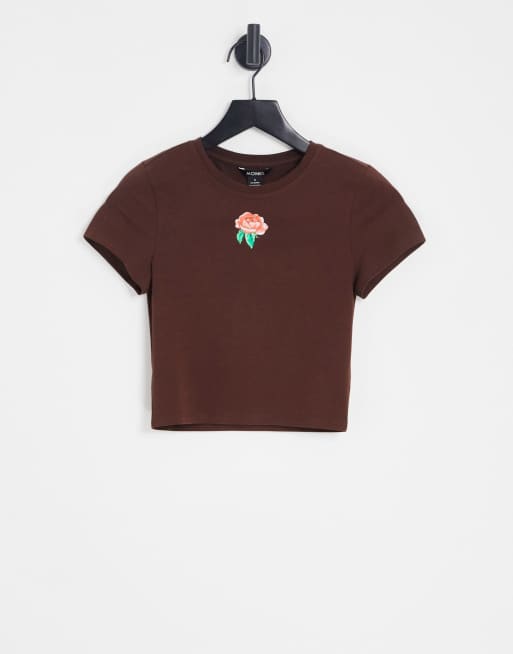 Monki t-shirt with rose logo in brown