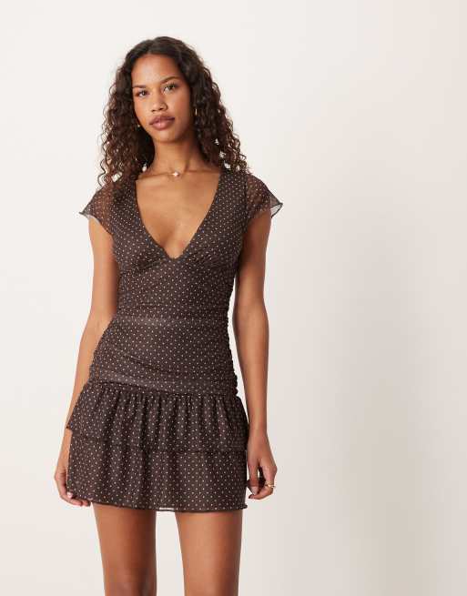 Motel Mowgli flutter sleeve ruffle dress in brown pink polka