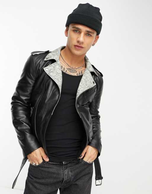 Muubaa belted leather biker jacket with white contrast lapels