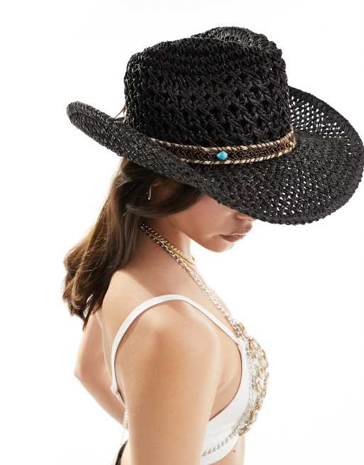My Accessories adjustable beaded trim straw cowboy hat in black