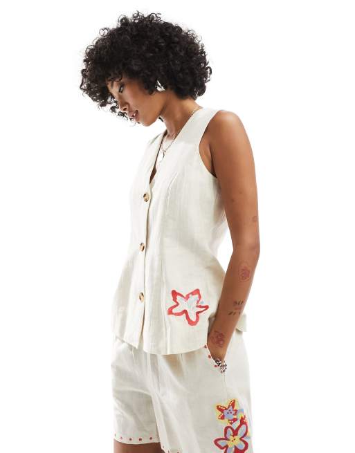Native Youth embroidered button through linen waistcoat in neutral (part of a set)
