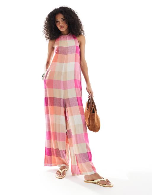Native Youth halter neck check jumpsuit in pink multi