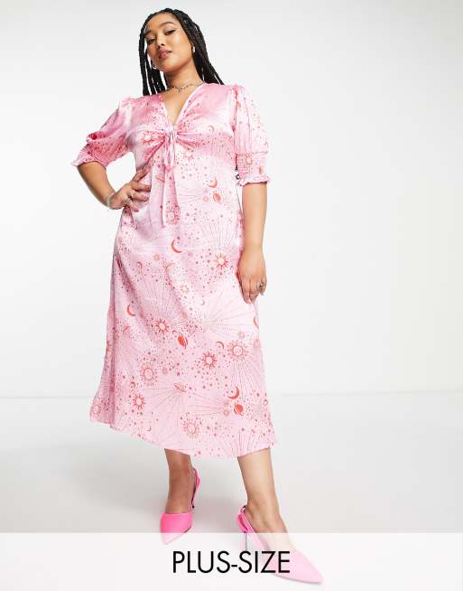 Neon Rose Plus ruched bust midi tea dress in pink red celestial satin