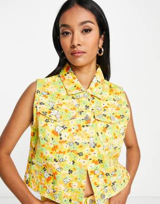 Neon Rose cropped vest in 70s floral denim (part of a set)