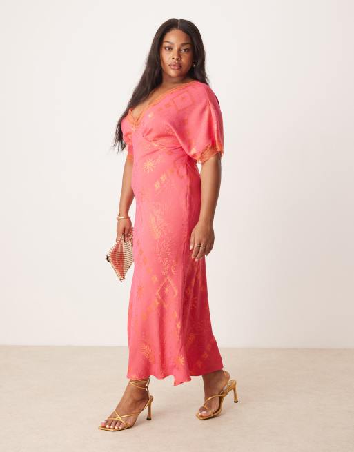 Never Fully Dressed Plus lace trim print midaxi dress in red and pink