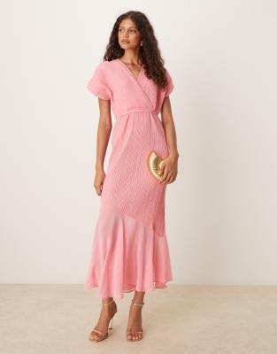 Never Fully Dressed asymmetric drop hem plisse midaxi dress in bright pink