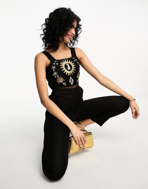 Never Fully Dressed embroidered leopard jumpsuit in black
