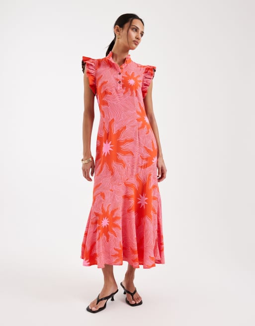 Never Fully Dressed Frida high neck frill sleeve midi dress in pink and red soleil print