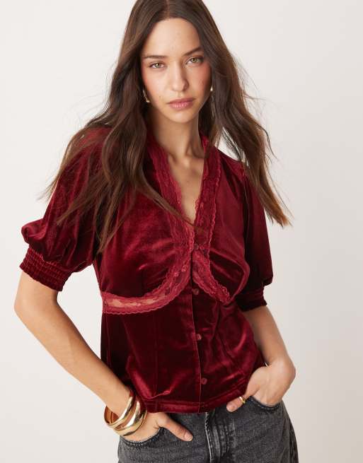 Never Fully Dressed lace velvet puff sleeve top in burgundy