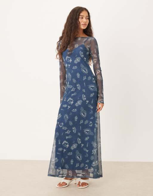 Never Fully Dressed long sleeve mesh maxi dress in denim motif print