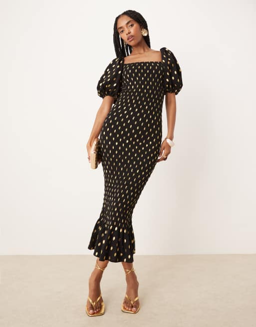 Never Fully Dressed puff sleeve shirred midaxi dress in black