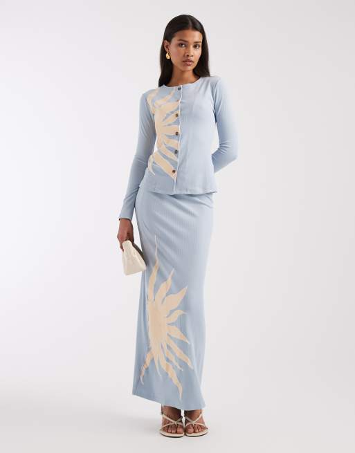 Never Fully Dressed ribbed cardigan and maxi skirt set in ice blue sol print