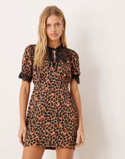 Never Fully Dressed satin lace trim mini dress in cherry leopard print