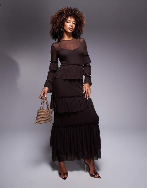 Never Fully Dressed sheer ruffle mesh maxi dress in chocolate
