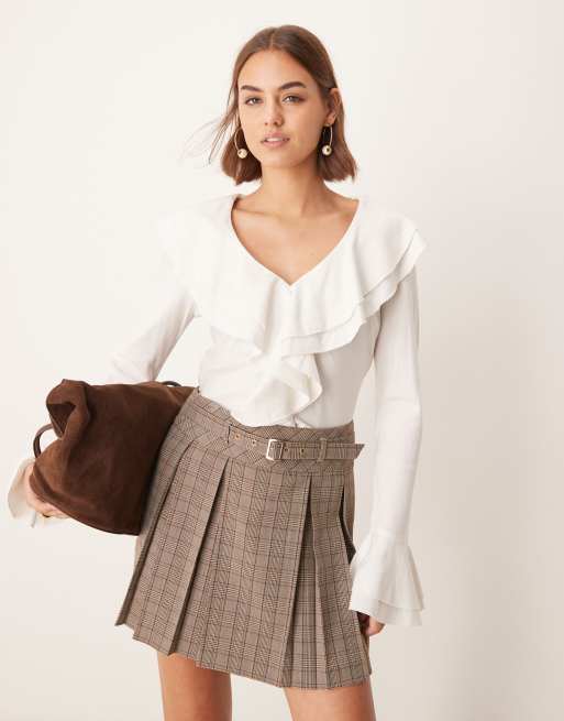 New Look check pleated mini skirt with belt in brown