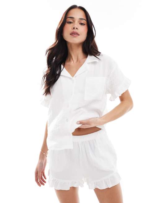 New Look double cloth frill trim pyjama set in white