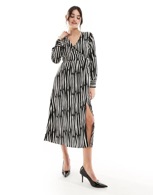 New Look long sleeve wrap midi dress in black and white stripe