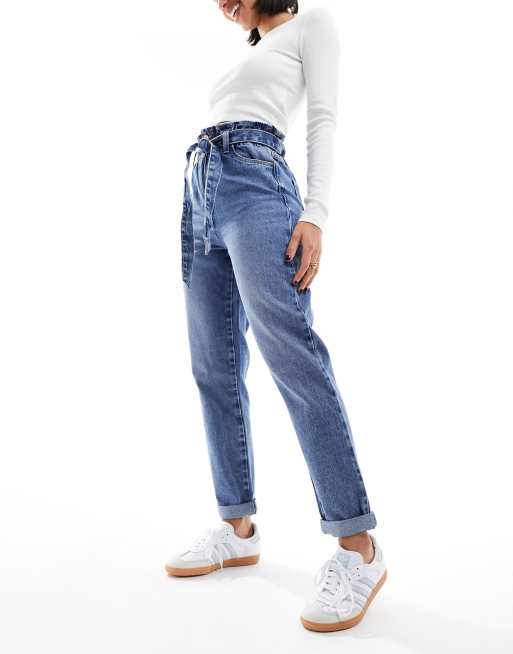 New Look paperbag waist straight leg jeans in mid blue