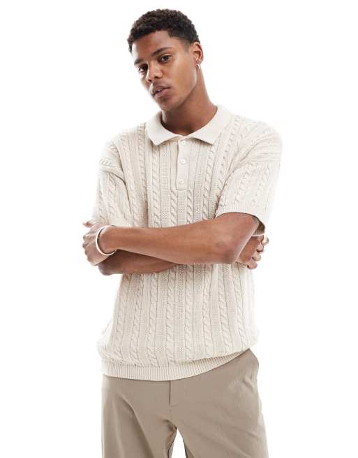 New Look short sleeve textured knit polo in off white