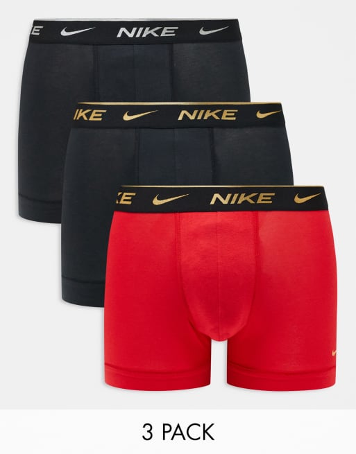 Nike Everyday Cotton Stretch 3 pack trunks in black/red with gold waistband
