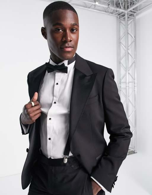 Noak 'Bermondsey' slim tuxedo suit jacket in black worsted wool blend with stretch