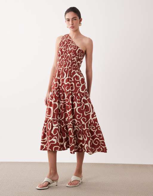Nobody's Child Cecilia one shoulder tiered skirt midi dress in brown abstract print
